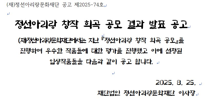 [공고] 제 목 : 정선아리랑 창작 희곡 공모 결과 발표 공고