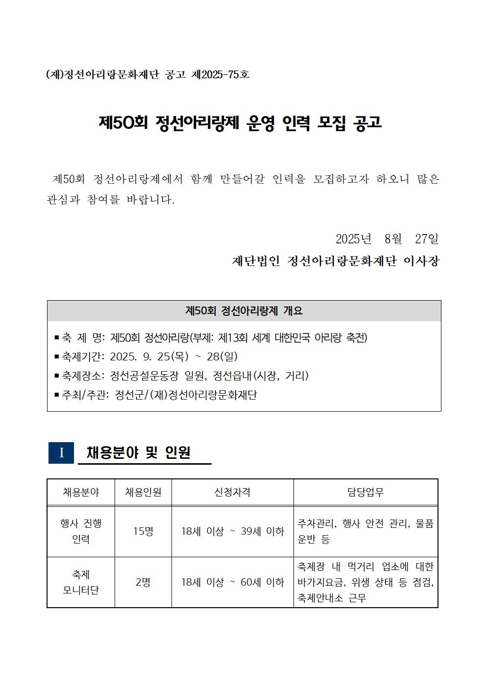 제 목 : 제50회 정선아리랑제 운영 인력 모집 공고
