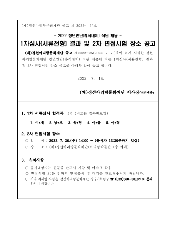 제 목 : 청년인턴(휴직대체) 직원 채용 1차심사 결과 및 2차 면접장소 공고