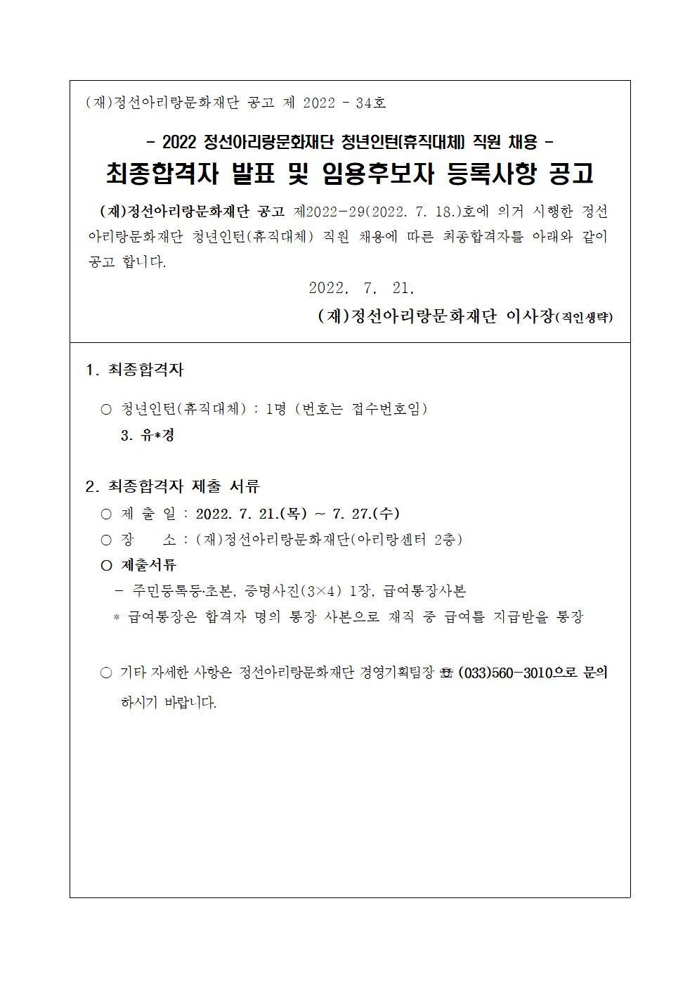 제 목 : 2022 정선아리랑문화재단 청년인턴(휴직대체) 채용 최종합격자 발표