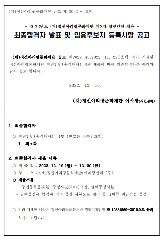 제 목 : 2022년 제2차 청년인턴(휴직대체) 채용 최종합격자 발표