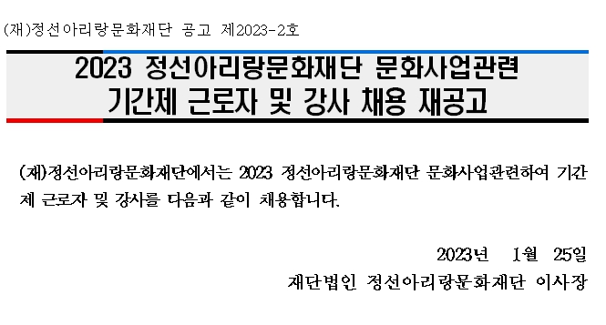 | 첨부 | 붙임+가.2023+문화사업팀+기간제+근로자+채용+계획꿈오,+정선아리랑제+재공고문.hwp , 붙임+나.2023+문화사업팀+기간제+근로자용+붙임+서류+양식.hwp , 붙임+다.2023+문화사업팀+꿈의+오케스트라+강사용+붙임+서류+양식.hwp | ||||