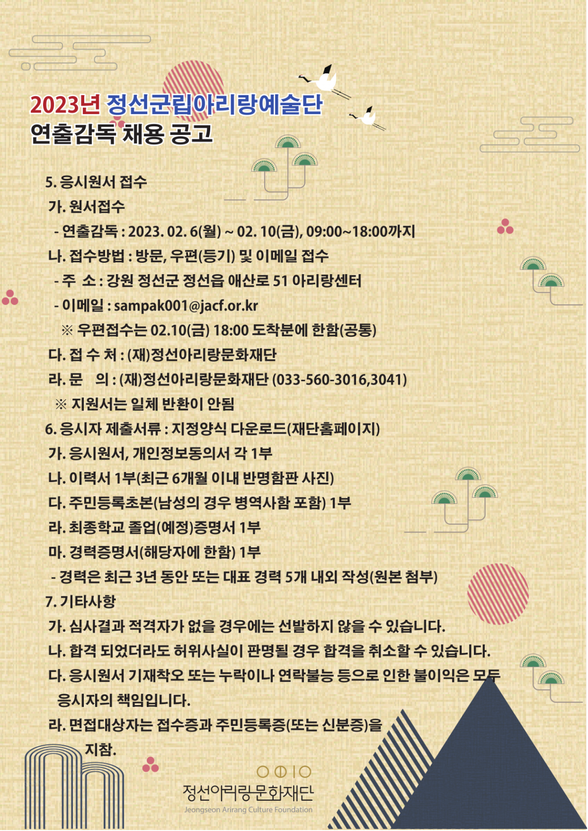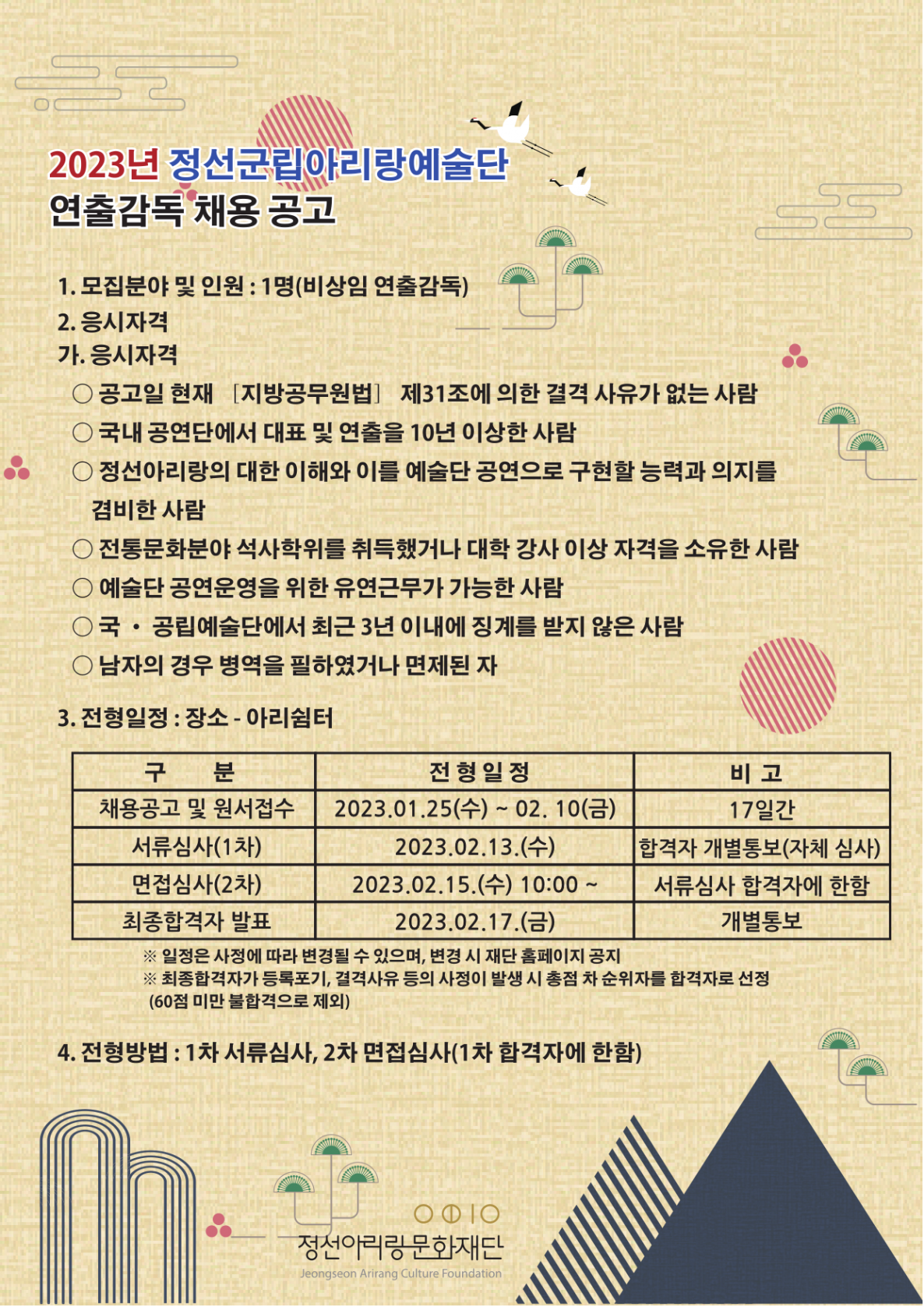 | 제 목 : 2023년 정선군립아리랑예술단 연출감독 채용 공고 | |||||