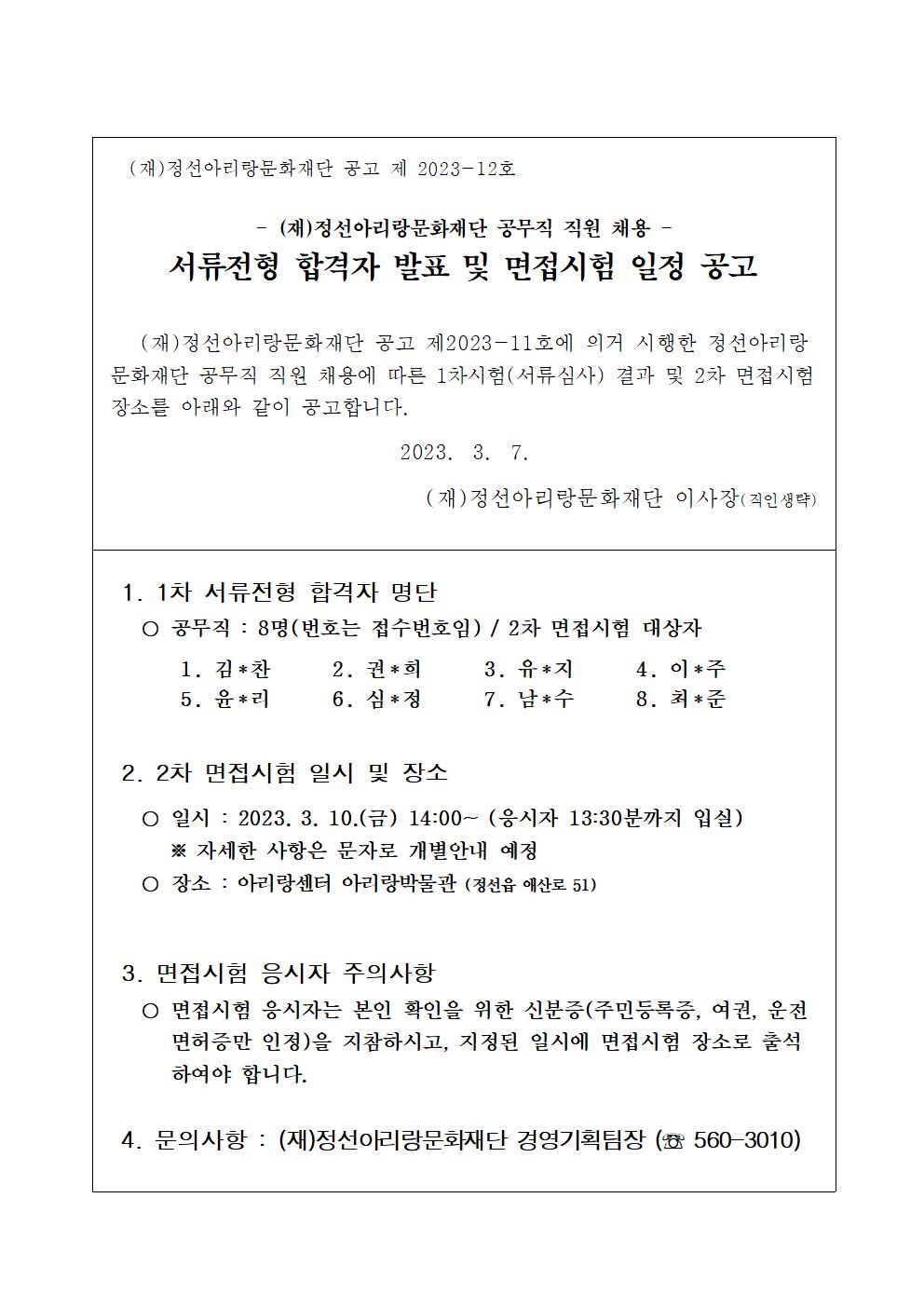제 목 : 공무직 직원 채용 1차시험(서류전형)결과 및 2차 면접시험 장소 공고