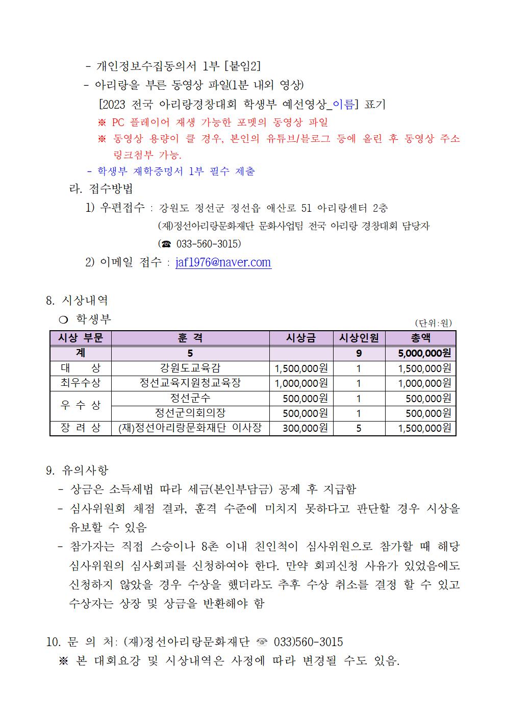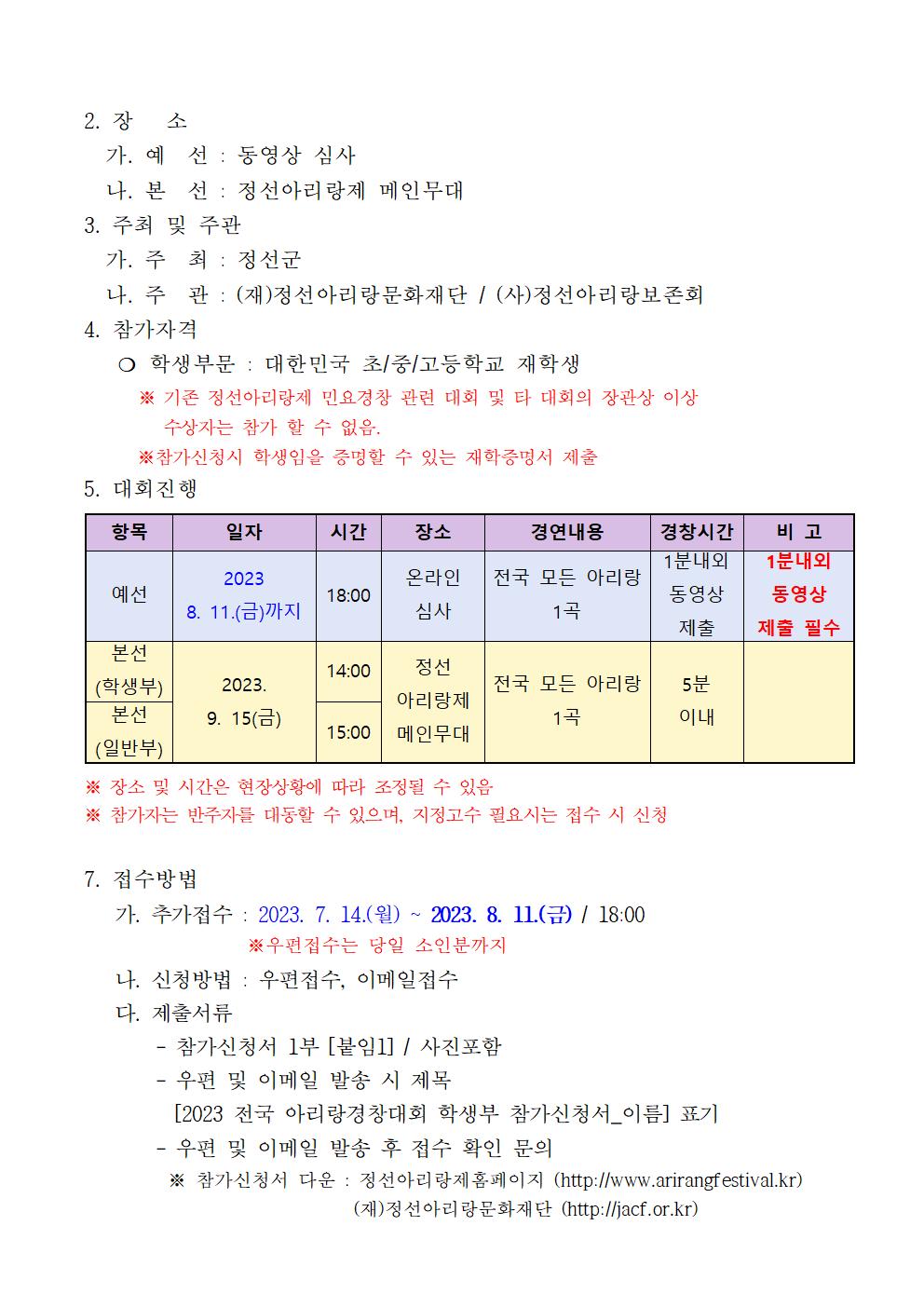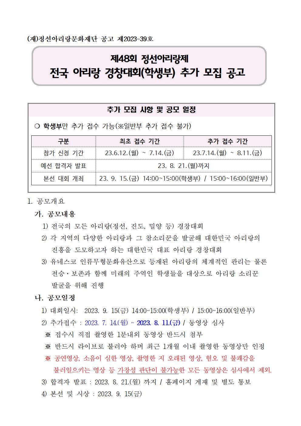 [일반] 제 목 : 제48회 정선아리랑제 전국 아리랑 경창대회(학생부) 추가 모집 공고