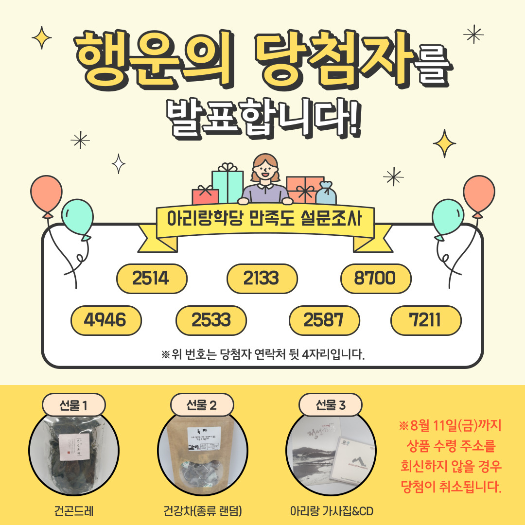 [일반] 제 목 : 정선아리랑 상설체험관 '아라리학당' 만족도 이벤트 설문조사 8월 당첨자 발표