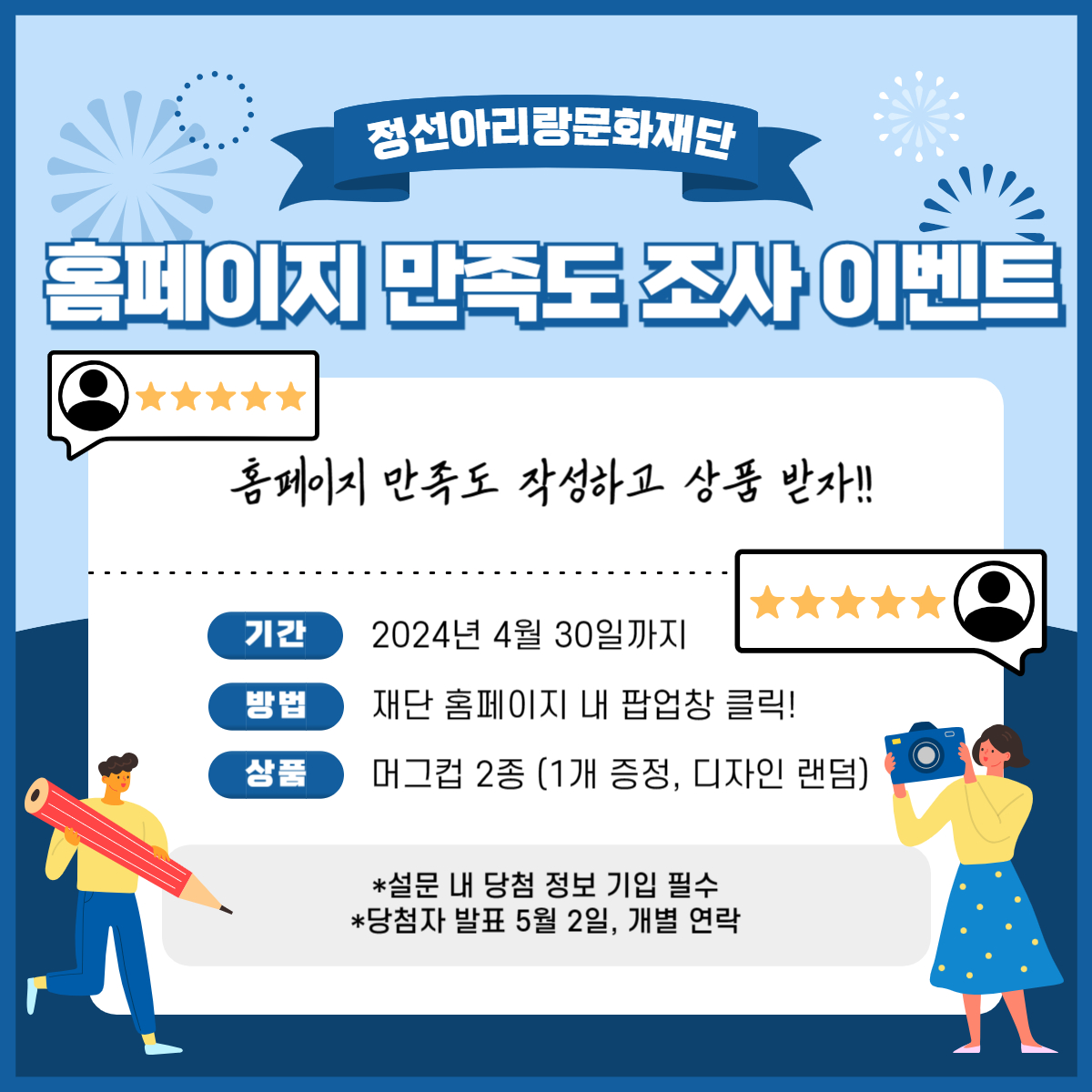 <2024 정선아리랑문화재단 홈페이지 개편에 따른 만족도 설문조사 참여 안내> 설문조사 기간 : 2024. 04. 01. ~ 2024. 04. 30. 설문조사 링크 : https://naver.me/FS5TGcOe 관련 문의 전화 : 033)560-3022 많은 참여 부탁드립니다! ![]() |