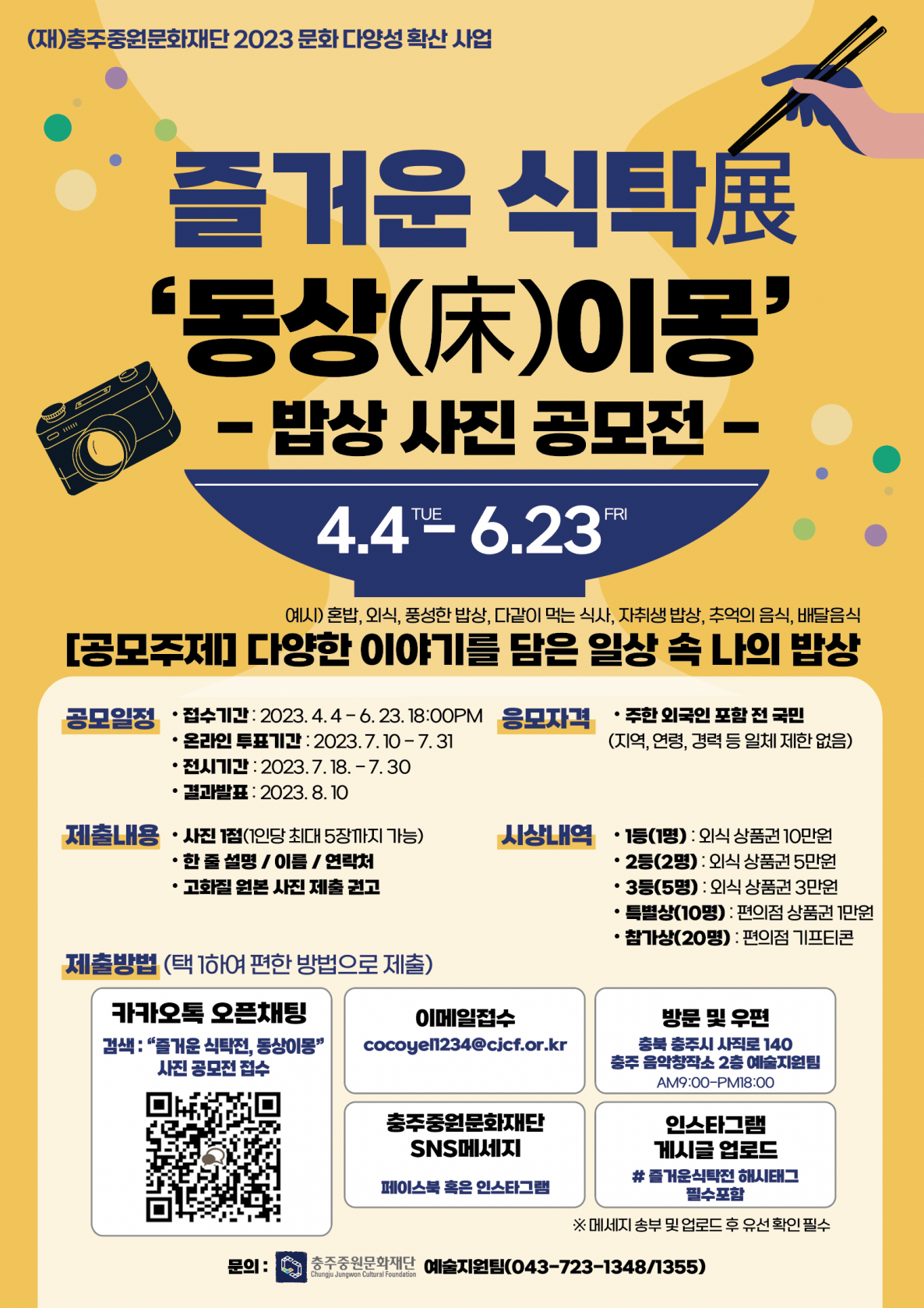 | [일반] 제 목 : 2023 문화다양성 확산 사업 사진공모전 "즐거운 식탁전, 동상이몽" 공모 홍보 | |||||